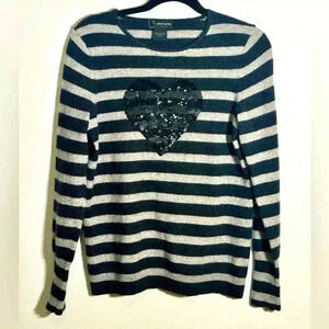 C BY BLOOMINGDALES 2 ply cashmere sweater. Striped with sequin heart. Size large
