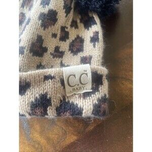 C. C Baby Beenie Hats. One Leopard Print with black Pom Poms and one solid grey with a tan pom. Will sell separately.