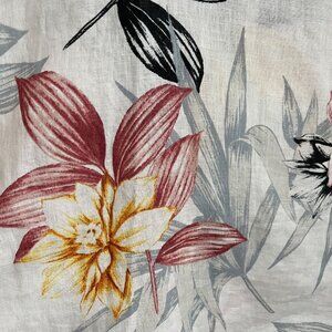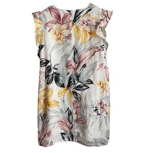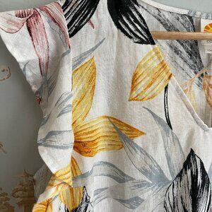 Beautiful C & C California 100 percent linen dress in size Medium. Features a vibrant tropical floral print with shades of yellow, red, black, and gray on a natural linen background. Designed with a flattering V-neckline and flutter ruffle cap sleeves. Lightweight and breathable—perfect for summer vacations, beach days, resort wear, or casual outings.