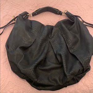 Black python print hobo bag. Bag measurements are 19 x 13.5 x 7. Slouchy leather fabric in good condition. Gold hardware has scuff marks.