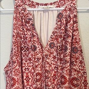 Stylish red patterned sleeveless dress. Features a V-neck and tassel details. C&E size large. Fully lined.