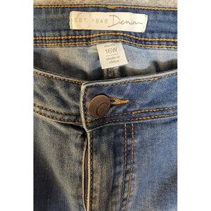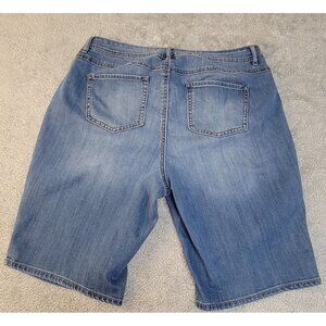 These are C. Est. 1946 Denim Shorts, size 16W, light blue with distressed elements. They are made of a blend of cotton, polyester, rayon, and spandex, giving a comfortable fit while still allowing for flexibility. The closure is a classic button/zipper combination. Please see the provided photos for further details.
