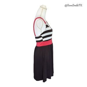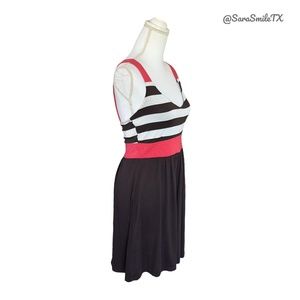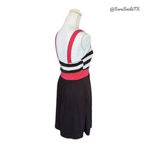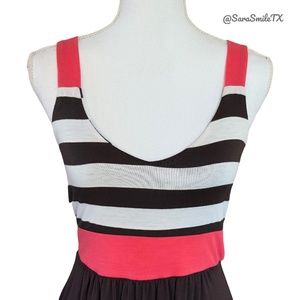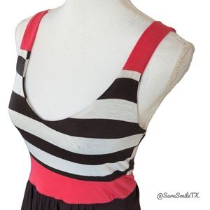 C. GRAFFITI brown, pink & white fit & flare mini sundress. Sleeveless. Scoop neck. Striped bust. Above knee length. Very stretchy & comfortable. Bought at NORDSTROM. Excellent used condition. No holes or stains. Material: 60% polyester, 32% rayon, 6% spandex. Measurements (approx/laying flat): 16" bust, 14" waist, 25" hip, 35" length. Made in USA. Size Small. Retail $55.