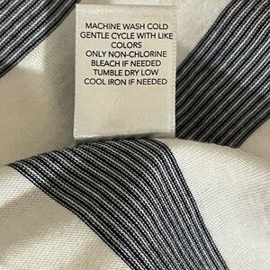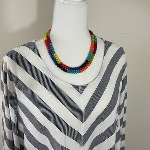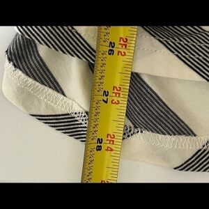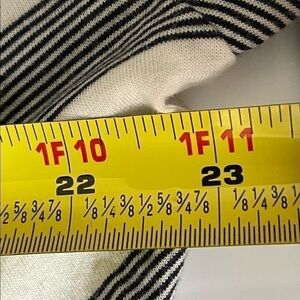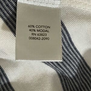 Very Attractive tunic style top with a nice shape to it. Hangs loosely. The stripes are done in all white and the other stripe is done in a fine blue and whit stripe. The seam down the center front has the stripes pointing down. And the back center also has the stripes pointing down also. Measurements are armpit to armpit flatfold about 23”. The length from top of shoulders to hem is about 28”. No visible flaws. Any questions please ask. Will answer questions as soon as possible. F