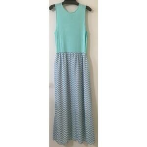 Medium sleeveless maxi dress blue yellow white chevron pattern on the bottom soft T-shirt material on top lined on the bottom.