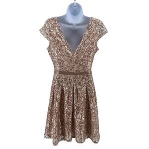 Women's Gold Champagne Sequin Mini Dress by C. Luce, US Size Small, Gold in Color, Short Dress, Deep V-neckline, Cap Sleeves, Back Hidden Zip, Mini Dress, Pleated Skirt, V back, Party, Club, Evening, Casual wear.