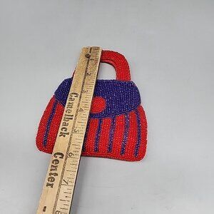 The C. MARIE Seed Beaded Coin Purse is a vintage-style clutch designed for women. It features a red and purple exterior with intricate beaded accents, a red silk lining, red hardware accents, and a zip closure. The small size and unique coin purse accessory make it a stylish and functional accessory for any outfit. This purse is a part of the C. MARIE product line, adding a touch of elegance to any ensemble.