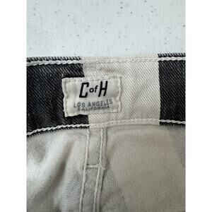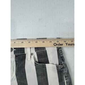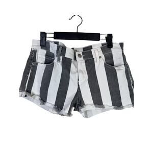 C of H (Citizens of Humanity) high rise denim cutoff shorts, size 28. Featuring bold black and white vertical stripes with distressed raw hem details. Button and zip closure, lightweight cotton denim perfect for summer, concerts, or casual outings. Light blueish spots present on front (see photos). Stylish and rare festival-ready shorts.