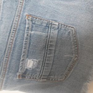 Light distressing on one back pocket and right leg on top of front pocket, 5 pocket style with belt loops, lighter wash, rise measures 8.5" from crotch to waist inseam 2.5" . good pre-owned condition. pet friendly non smoking home