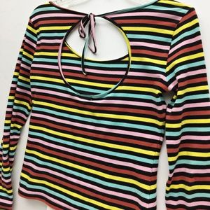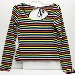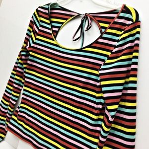 C. RONSON Top Candy Stripe Multi Color Scoop Neck Back Tie Bow Long Sleeve