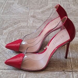 Gently worn Schutz cendi pump heels/stilettos in size 6B. gorgeous red color with transparent sides. lots of life left in these heels!
