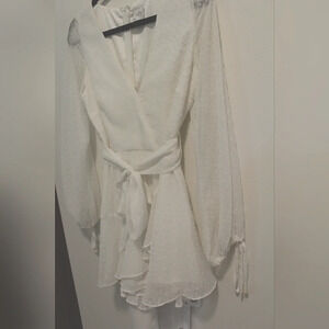 Gorgeous white Selfie Leslie Chiffon dress with polka dots & lovely sleeves. Mini length. Worn twice. The dress has one tiny spot that needs to be spot treated on the sleeve string. You don't notice it all, unless you are looking for it.