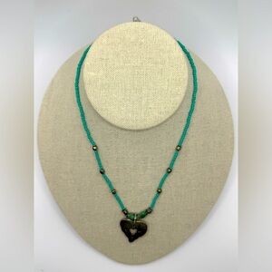 This necklace is by C Stein and has a heart pendant with crosses on it, seed beads in the color of turquoise. It can be worn from 15.5" up to 18".