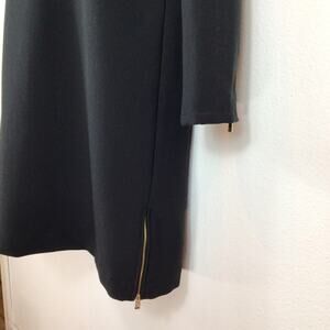 Long sleeve, round neck shift dress with exposed gold zipper accents on sleeves and hem