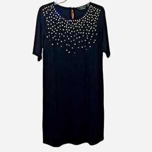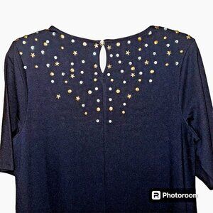 Step into cosmic glam with this stunning C Wonder black midi dress, size 6. Featuring radiant star-shaped gold studs and rhinestone embellishments across the neckline, this jersey knit sheath blends quiet luxury with festive flair. The stretch fabric offers comfort and contour, while the keyhole back adds a touch of elegance. Perfect for holiday parties, cocktail nights, or elevated everyday wear. A versatile piece for your fall fashion edit—pre-loved and in excellent condition. Style it with boots or heels for a timeless look.