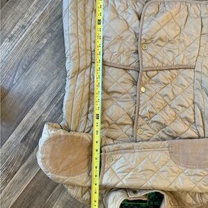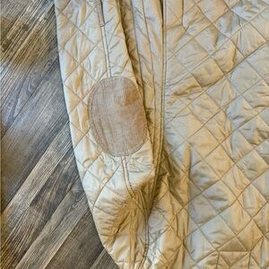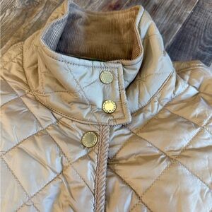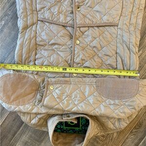 Stylish quilted jacket in tan with corduroy elbows accents. Features a unique preppy hunter green patterned lining. Perfect for Fall. No wear, stains and is in great condition. Two front pockets with gold accents. Corduroy piping accents.