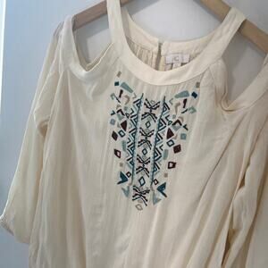 C Wonder Embroidery Cold Shoulder Blouse Size XL. Excellent condition, like new. White/cream with aztec style embroidery detail at chest. High neck. Relaxed fit. Long Sleeve.