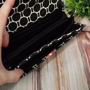 Features 8 credit cards slots, 4 open top compartments and full zip compartment in the middle. As well as front compartment.