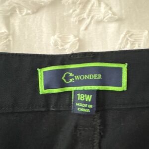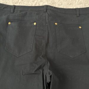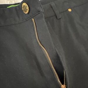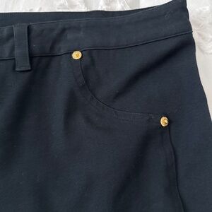 Never worn dark blue/black pants with two faux pockets in the front and two pockets in the back. The gold rivets and zipper make these pants suitable for both dressed-up and casual looks.