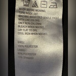 Content: 100% polyester (shell); 90% polyester, 10% spandex (lining)