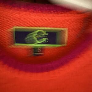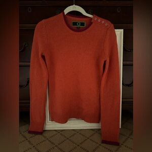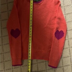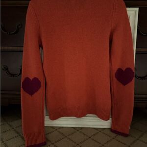 C Wonder orange crew neck sweater with 4 bottons along the edge of the collar which open up for a different look. The elbows have wine purple hearts woven in as part of the wool pattern. The same color trim is seen on the ribbed collar and cuffs. The wide ribbing at the bottom of the sweater is made for a little looser fit. This is an excellent qulaity wool sweater, NWOT S excellent condition, no rips tears or pulls. A great investment piece.
