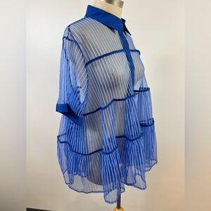 This chic blue sheer striped button-up top. Perfect for layering or wearing on its own, this top adds a touch of elegance to any outfit. It feels great on the skin. I bought this in Miami and wore it once. Perfect for summer and festival season! 65%polyester, 35%cotton. Made in China. Machine washable.