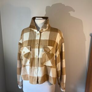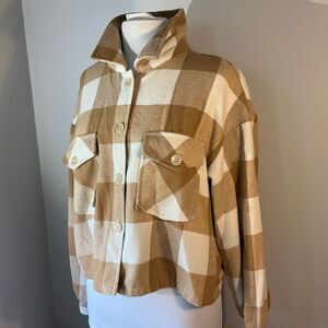 C by One Button Up Cropped Shacket, Large. Cream and Tan Buffalo Plaid. Perfect