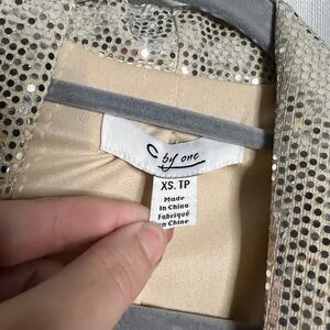 C by One Silver Sequined 3/4 Sleeve Long Line Blazer. Silver sequins all over. Open style blazer. 3/4 rouched sleeves. Front lower pockets. Missing a tiny patch of sequins on one of the arms, very small. Oversize fit, perfect for going out or party. Size XS (fits easily up to a Medium).