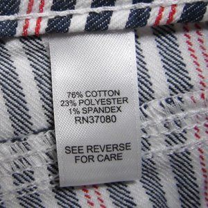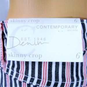 NWT Size 6. Red, White and Blue Striped, Skinny Crop Jeans, Contemporary, Mid Rise, Raw Hem, 5 Pocket style, Front Button/Zipper Closure, Belt Loops, Approximate measurements taken laying flat in inches: Waist 14.5", In seam 24", Front rise 9"
