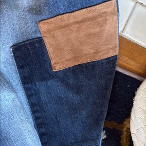 These boyfriend jeans showcase a relaxed fit with a unique blend of blue denim and brown patchwork accents. The distressed design, featuring frayed areas and intentional tears, adds a vintage-inspired touch. Perfect for a casual, laid-back look with an artisanal flair. Good shape- super cute