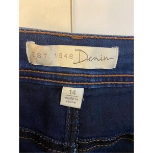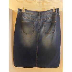 C est 1946 denim skirts size 14 rn# 37080. measurs 17" across the waist, 25" long. 81 cotton. 17 poly. 2 spandex. good used condition.