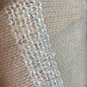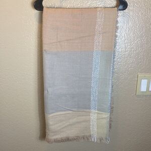 C large square scarf soft raw edges muted pink blue tan colorful yarn woven in
