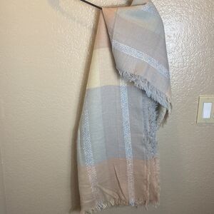 C large square scarf . Raw fringed edges. Muted blue/pink/tan