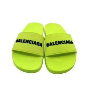 C0 Auth BALENCIAGA Logo Rubber Pool Slides Flip Flops Neon Green Womens US 6
