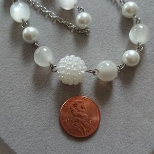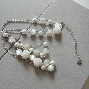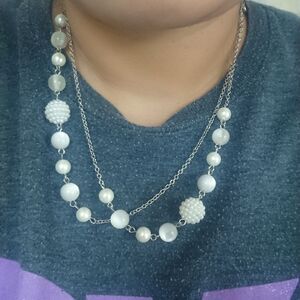 C1946 silver and white tone double strand beaded chain necklace featuring faux pearls and white beads.