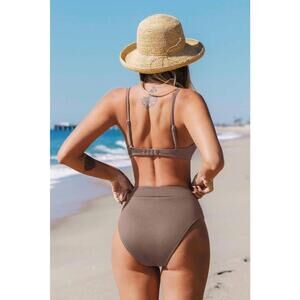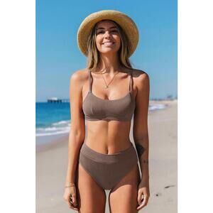 C201 NWT Cupshe Rib Scoop Neck Bralette High Waist Brown Bikini Set - Size Large