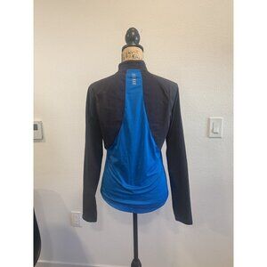 The Under Armour HeatGear Fitted 1/4 Zip Pullover Shirt for women in size medium is a versatile activewear top perfect for fall and spring seasons. Made of lightweight and breathable polyester blend fabric, this pullover features a collared neckline, long sleeves, and a solid charcoal color with blue accents. With a slim fit and compression areas for the chest, arm, and body, this top is designed for running and jogging activities. Easy to care for with machine washable instructions, this pullover combines style and functionality for active women looking for a high-performance top.