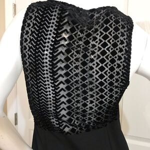 See thru back with velvet patterns. Stitching at the waist make it very flattering. Modeled on a 5'8"mannequin.