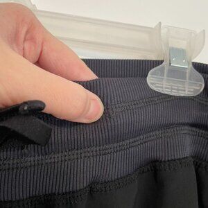 ◇ Size large. Black / dark gray grey colorblock color block. Swishy slippery ish athletic material. Pull on / elastic waist with adjustable drawstring waist. Gathered elastic banded trim at hems. Real front pockets. Capris capri pant capri pants / activewear active wear pants pant.