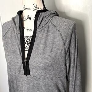 1/4 zip neck with hood and Split hem styling for comfort at waist. Size Small. Good Preloved Condition!