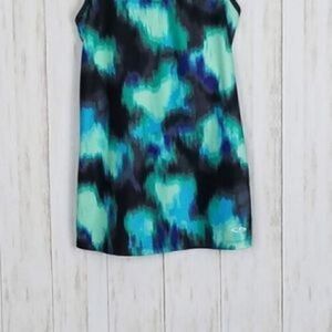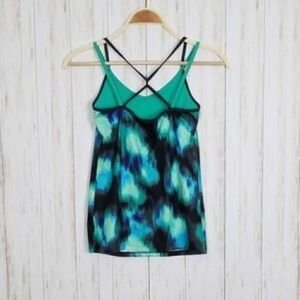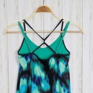 Fitted sleeveless athletic tank top. Double straps which crisscross on the back. Built in shelf bra. Features the colors: green, purple, blue, black & gray.