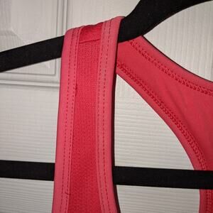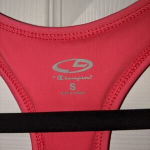 C9 by Champion Women's Pink Striped Active Tank Top in Size S. No tears or holes, but has slight discoloration on straps (pictured). Has a built in liner bra. Tank is pink even tho my camera makes it look more red. The red looking stripe is a dark berry. Body: 92% Polyester 8% Spandex/ Piecing: 100% Polyester/ Inner Bra: 90% Polyester 10% Spandex.