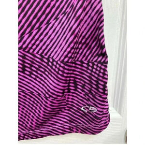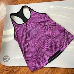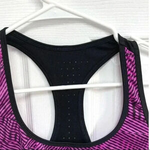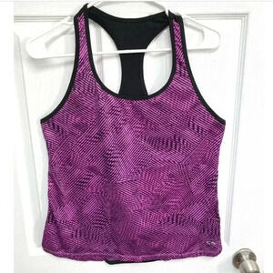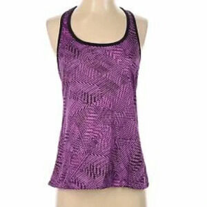 All tags were removed but fits like a large. Great workout tank top in bright colors making it ideal for outside elements. Quick dry material and venting mesh on back. Unknown if this is more pink or purple?