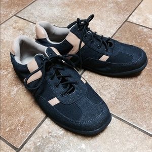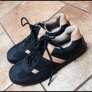 This is a Women sneaker size 7. These are Jean canvas shoes casual walk sneakers. Colors are blue and tan. The tan portion is leather. Hardly worn at all no stains or tears.