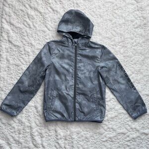 Stylish gray hooded jacket featuring a logo on the sleeve. Perfect for casual wear.The jacket is size 146 cm which corresponds to a size 10-12 boys in American size( also please check measurements). Lined, 2 front pockets and one inside pocket. Excellent used condition, worn a couple of times. Smoke and pet free home
