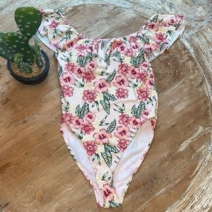 CABANA DEL SOL Off Shoulder Ruffle Top Tropical Print One Piece Swimsuit Size L