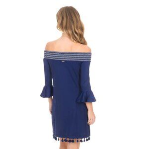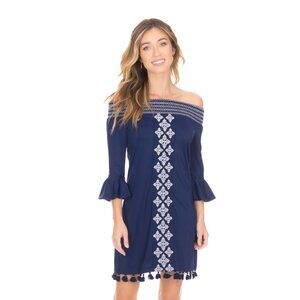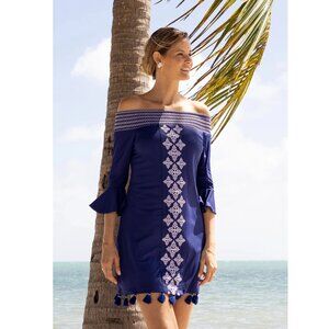 CABANA LIFE/Navy Embroidered Off The Shoulder Mini Dress Coverluxe Smocked Med