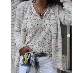 Beautiful Long Sleeve Button Front V- Neck Cardigan in Ivory with Pastel Stripes. Tortoiseshell Buttons and Ribbed Cuffs and Waist. From their Fall 2022 Lush Horizons Collection.