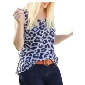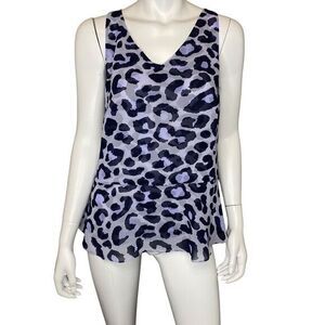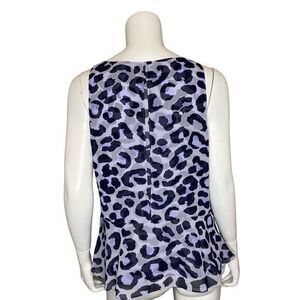 Cabi 5536 Feline Animal Print Chiffon Sleeveless Peplum Top in Periwinkle Blue & Black Leopard Print. V- Neckline. Women’s Size S