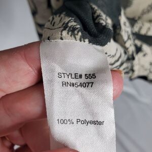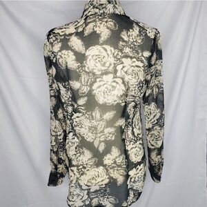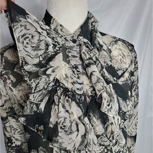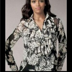 Cabi #555 irresistible black floral blouse. Very Victorian feel! Ruffles all up the front and around the collar. Great career piece. Polyester.